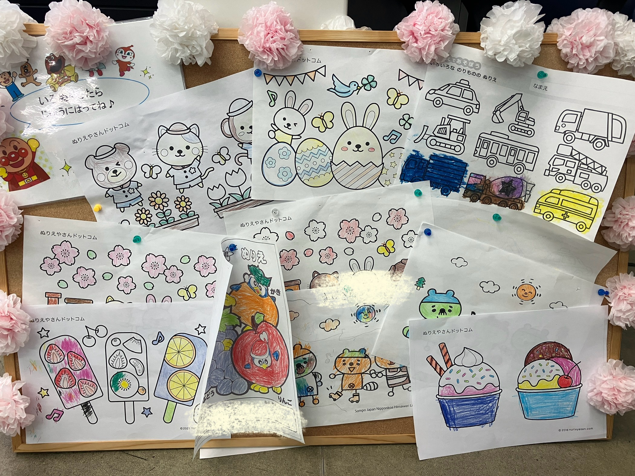 待ち時間、子供たちに楽しんでもらえるよう塗り絵を用意しておりますが、あっという間に展示する場所も絵で満杯✨