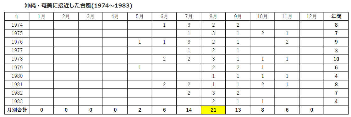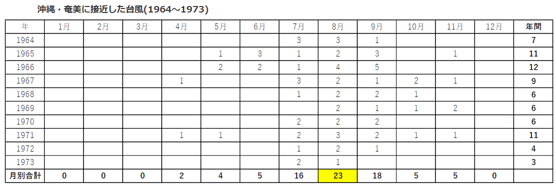 過去70年間の、沖縄、奄美へ接近した台風の数や時期が記録されていました