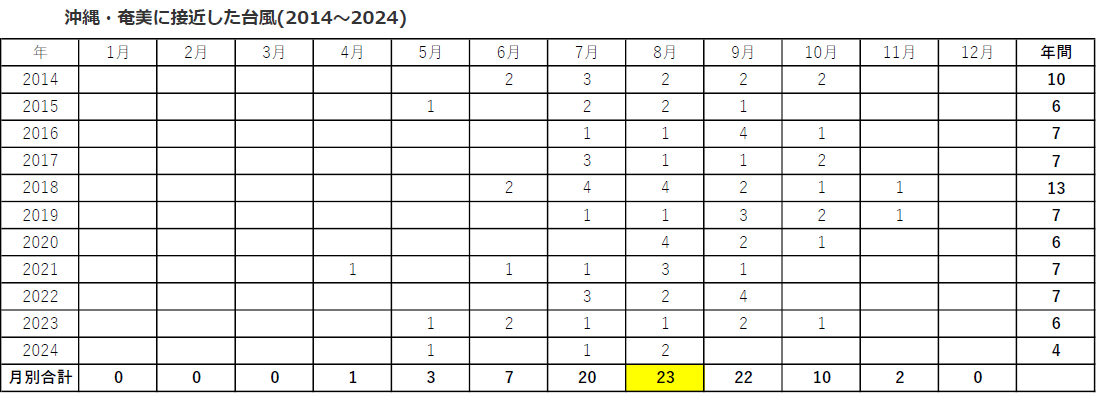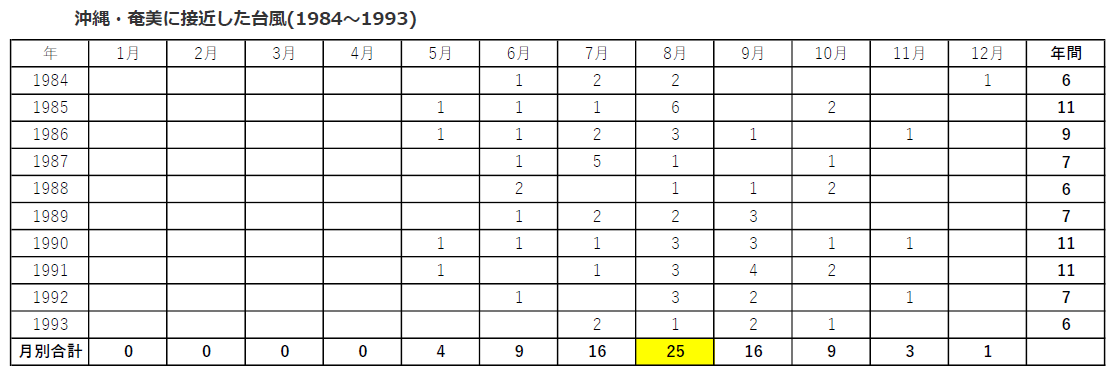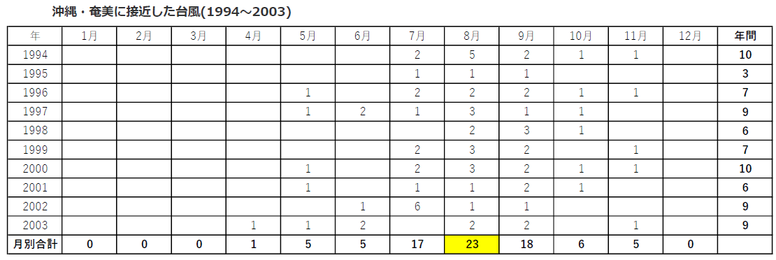 そんなところで、過去、沖縄に来た台風の回数や時期が気になったので