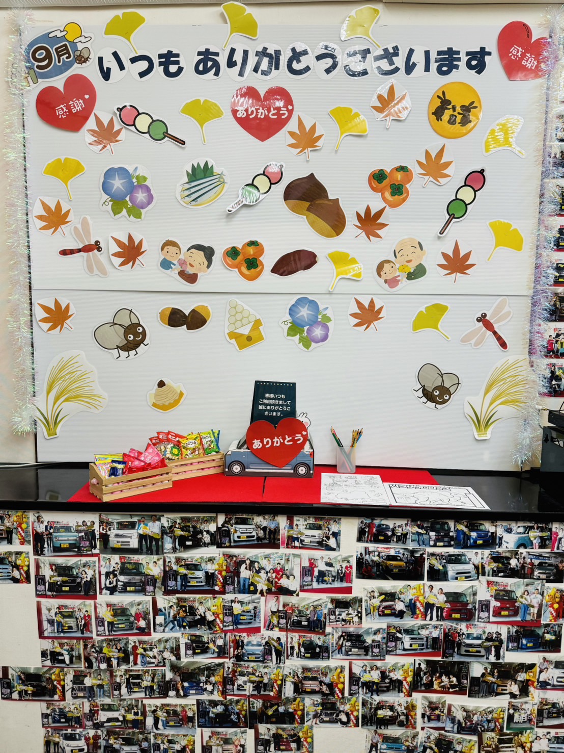 周りには、今まで当社でお車をご購入いただきましたお客様の、納車式の写真が沢山飾ってありますので、ぜひ見て頂ければ幸いです。