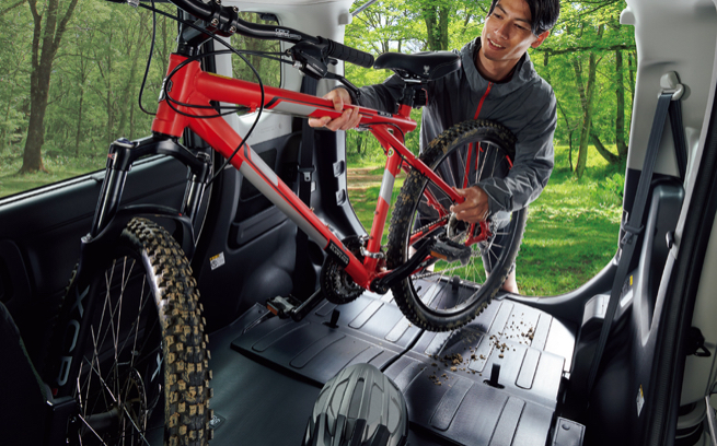 後席を倒せば自転車も十分につめられて、泥汚れや水にも強い防水フロア。